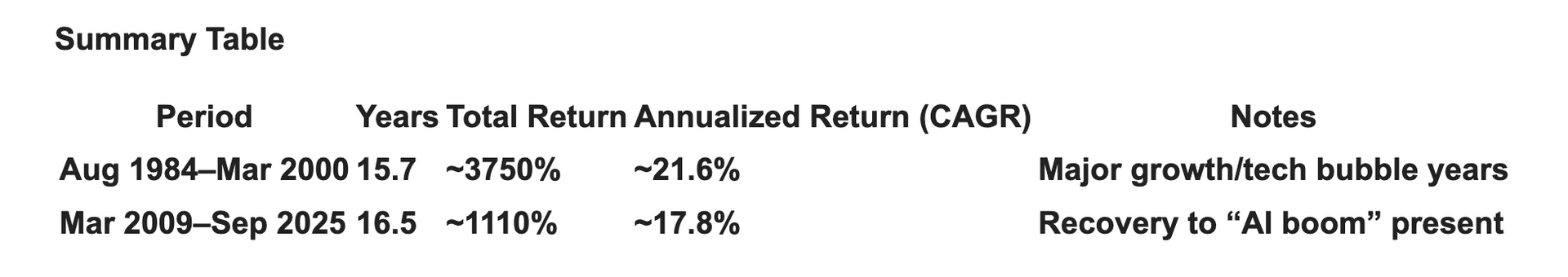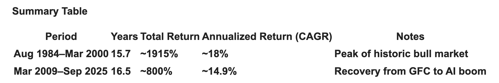 Here’s a direct comparison of the NASDAQ’s total and annualized returns (including dividends) for August 1984 to March 2000 and March 2009 to September 2025: